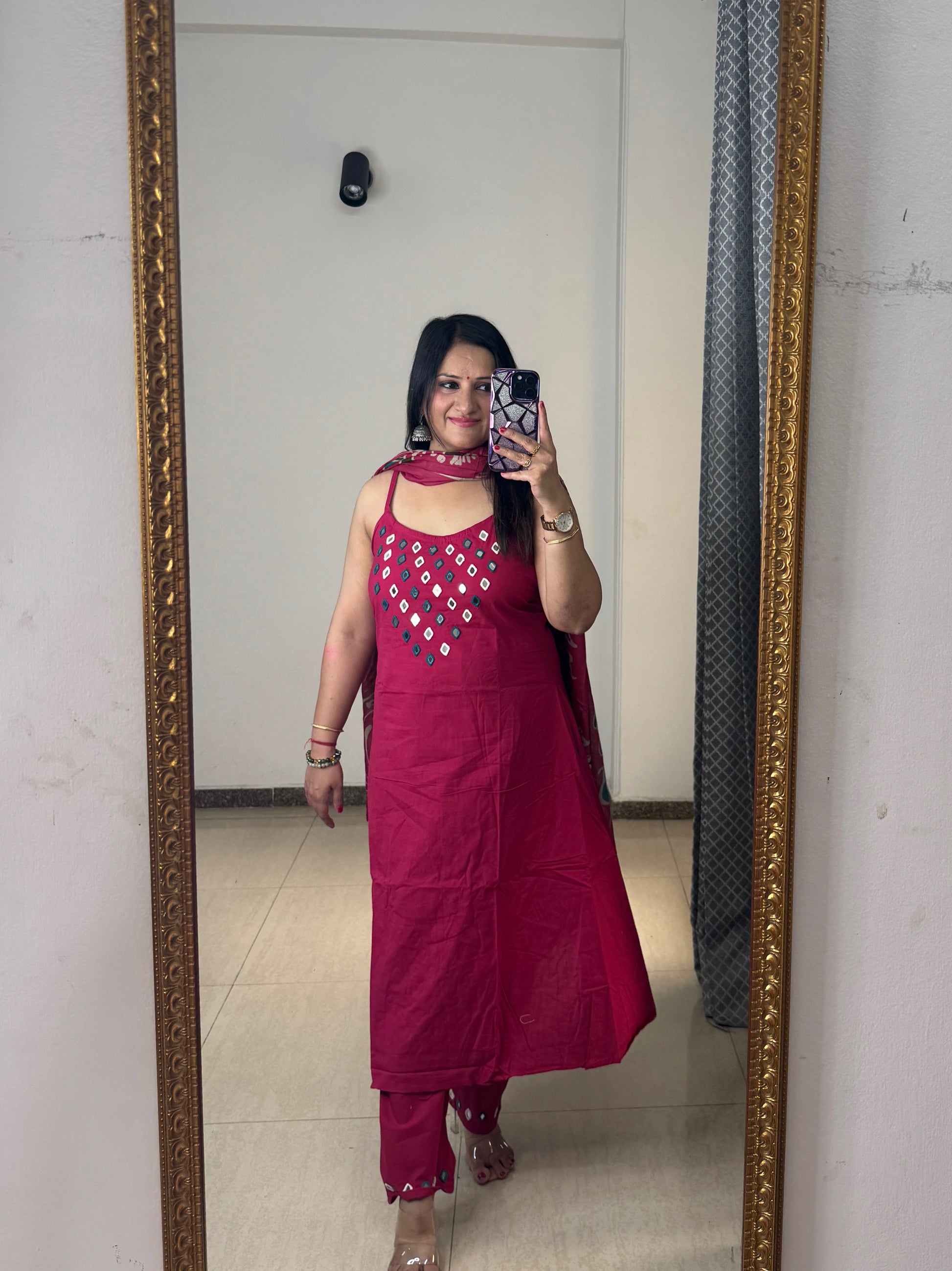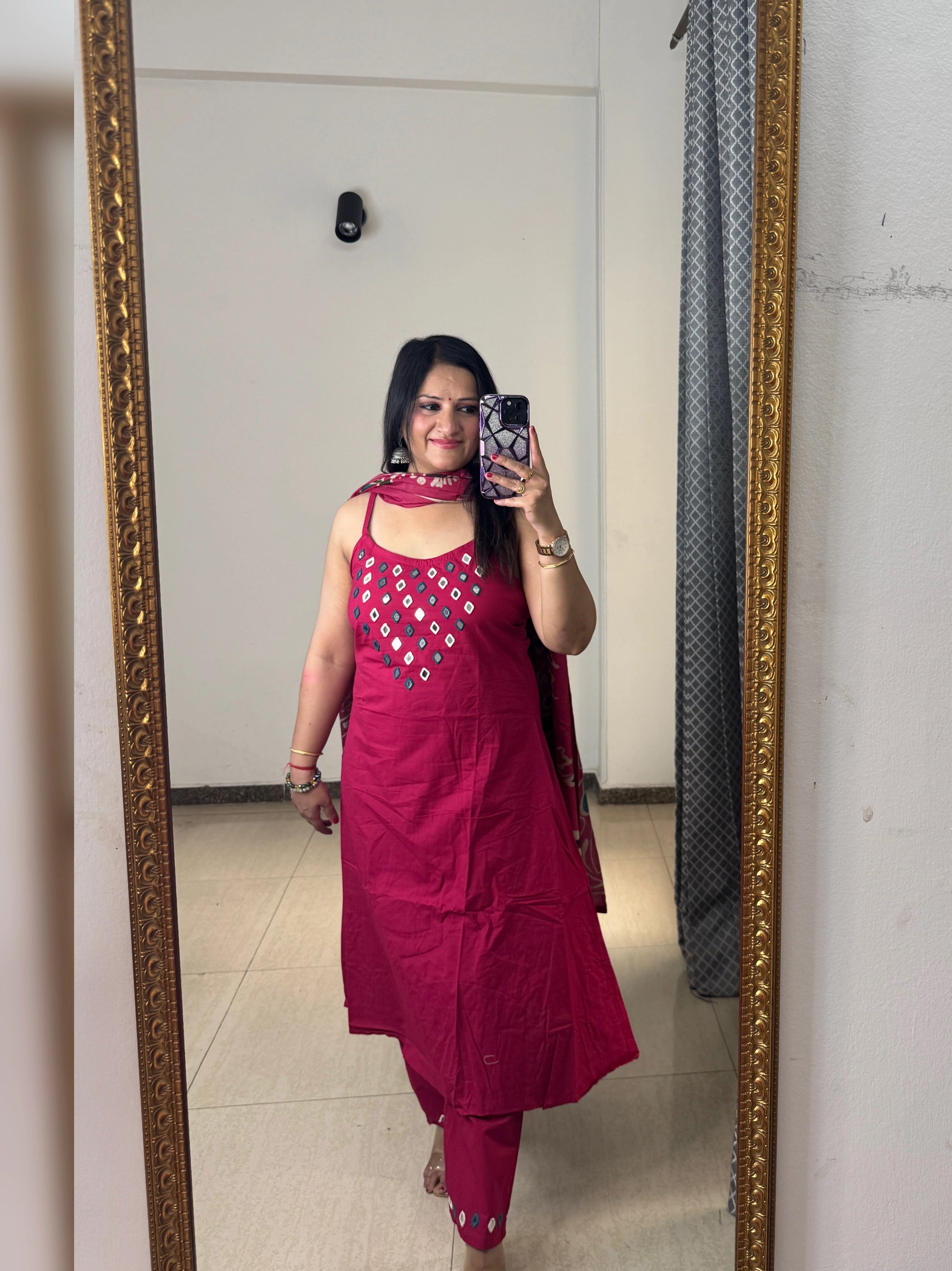 Ideal for warm weather, this lightweight cotton suit keeps you cool while offering a stylish, minimal, and elegant look. The strappy design adds a contemporary twist to ethnic wear, making it a must-have for your summer wardrobe.